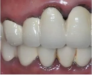 因金屬內(nèi)冠的存在,透光性、色澤和形態(tài)與自然牙存在較大的區(qū)別,更會在燈光下產(chǎn)生青灰色的效果。